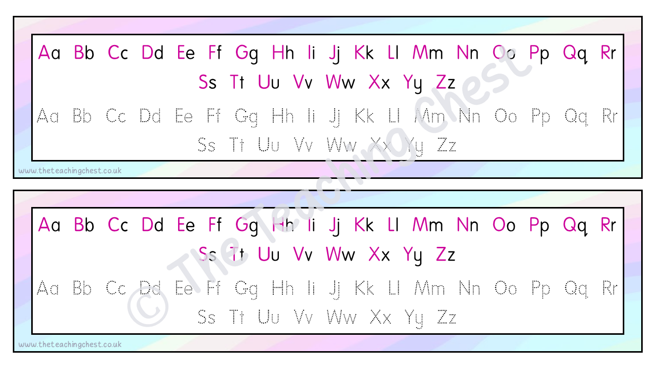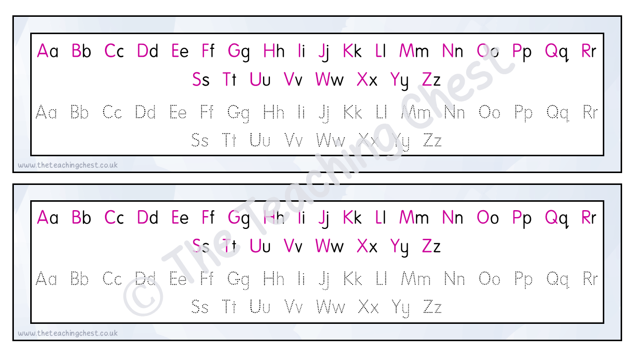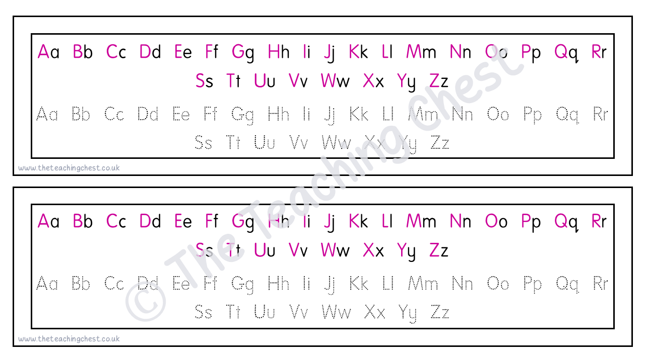 Alongside the main alphabet, each letter is shown in a dotted font that is suitable for tracing. This makes the resource particularly effective for early writers, those developing fine motor skills or children who need regular reinforcement.