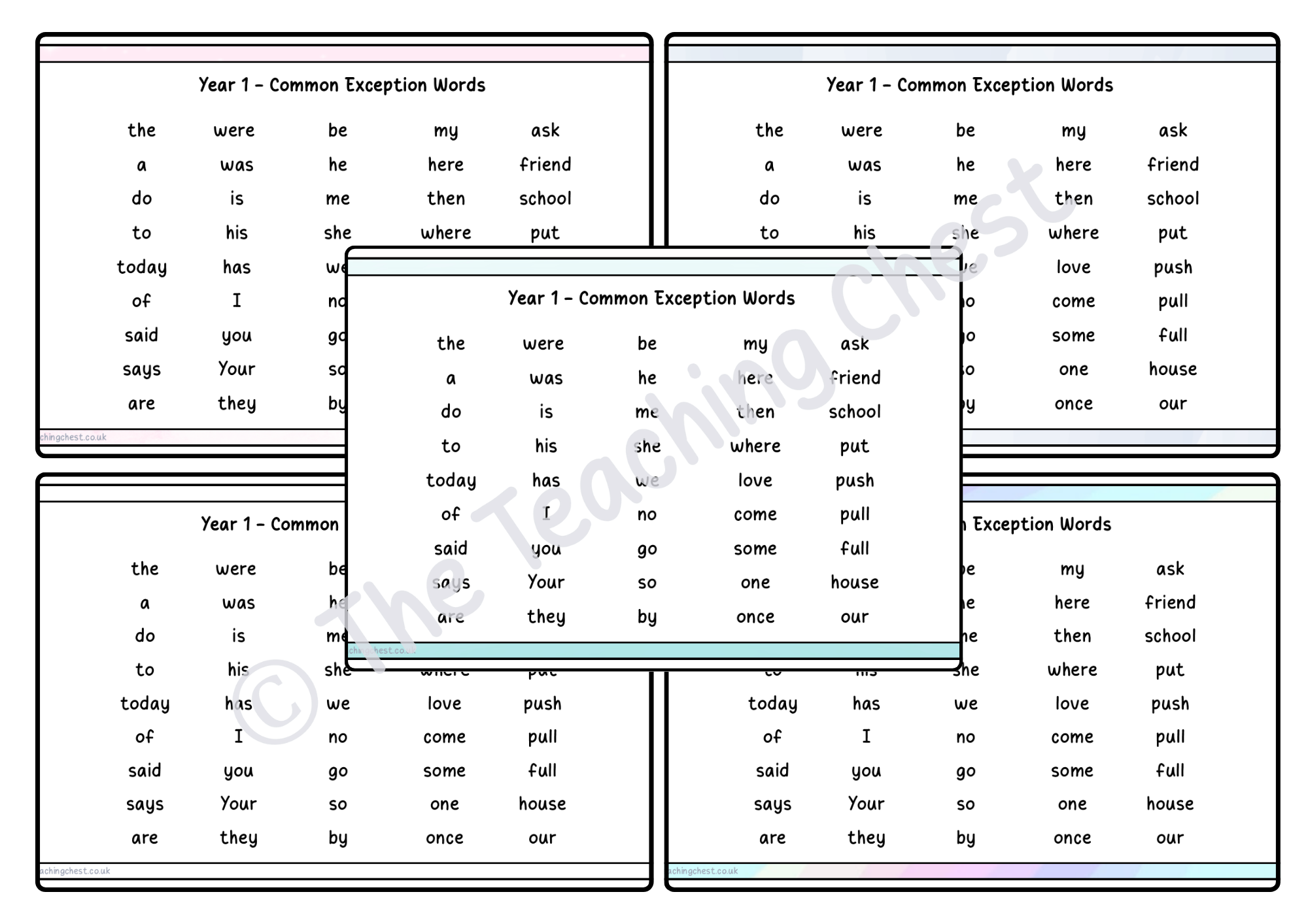 The resource contains 5 copies of the word mats with different background themes (green, soft pink, grey, rainbow and plain), to suit personal preferences and the aesthetics of your learning space.