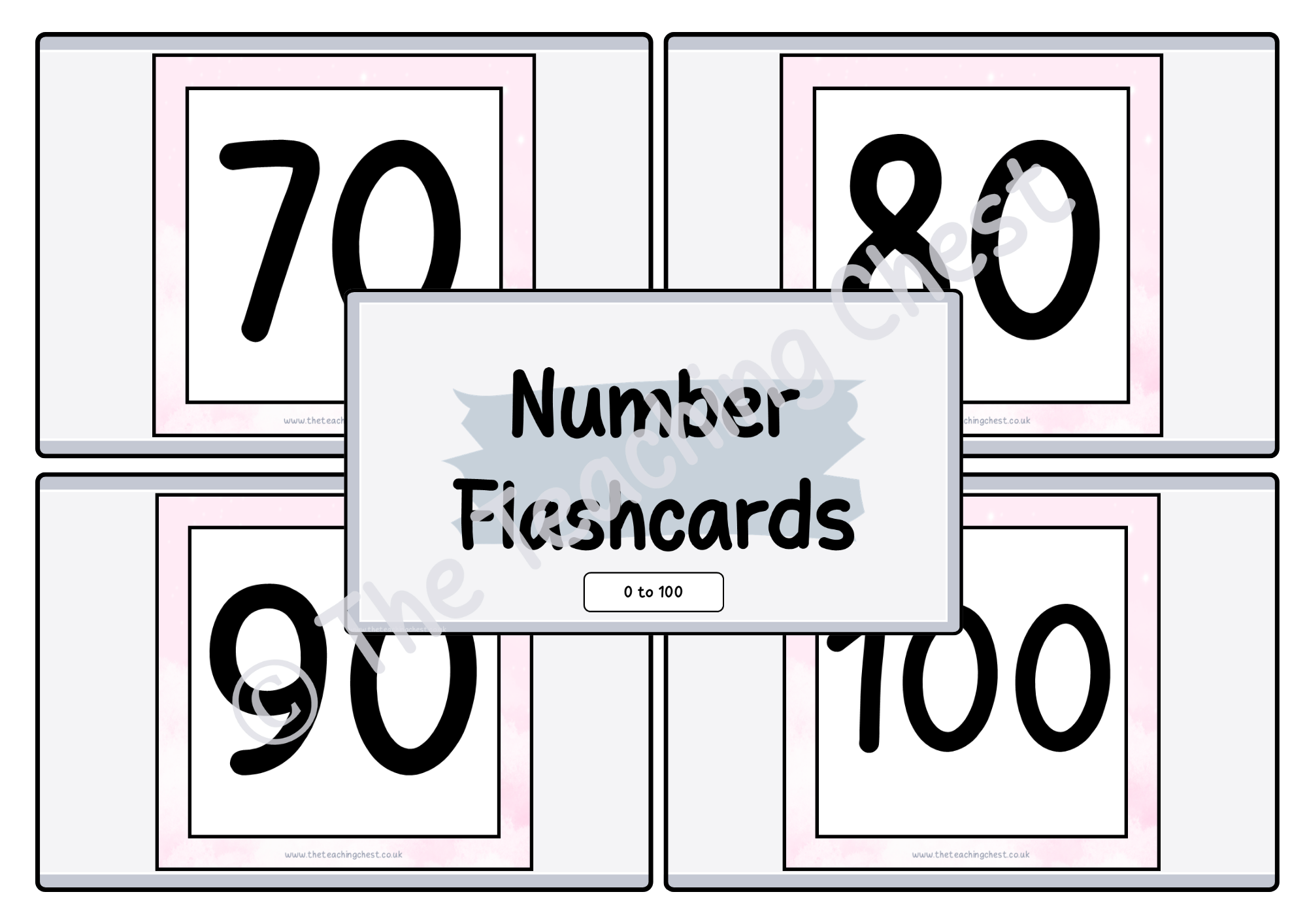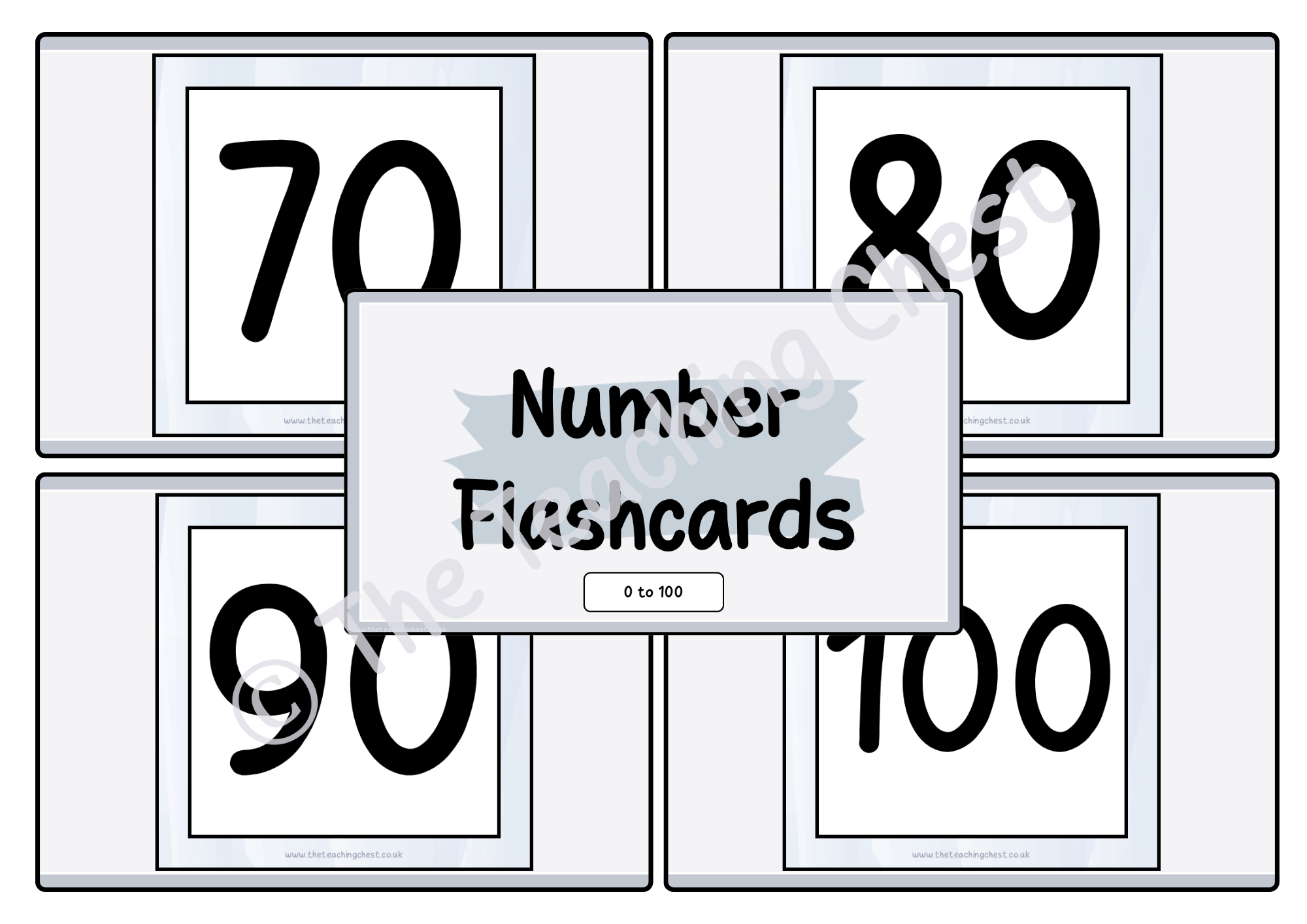 A set of number flashcards from 0 to 100 to support the recognition and recall of numbers.