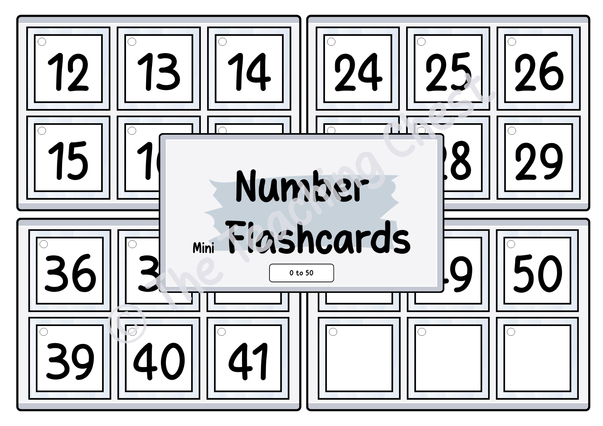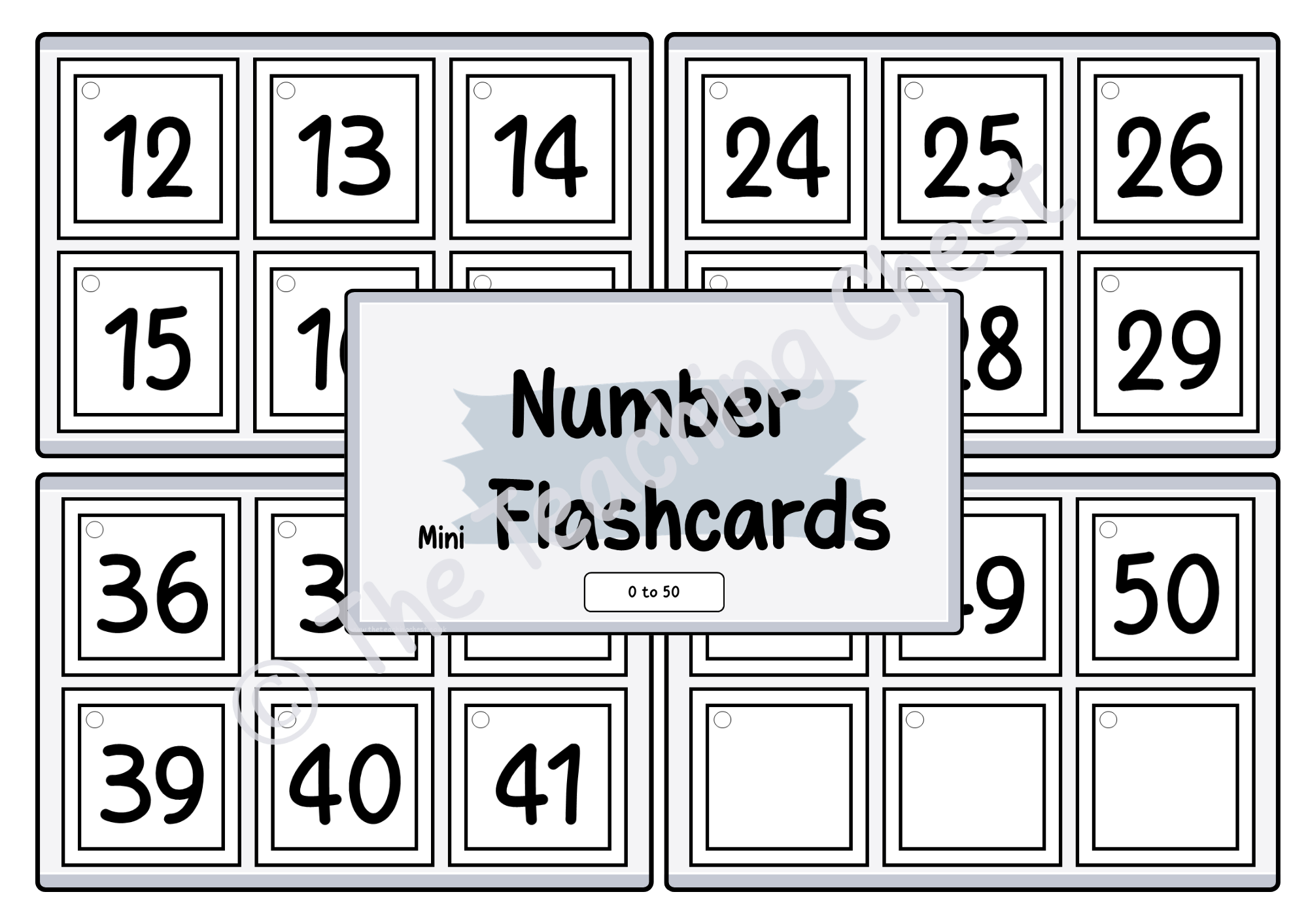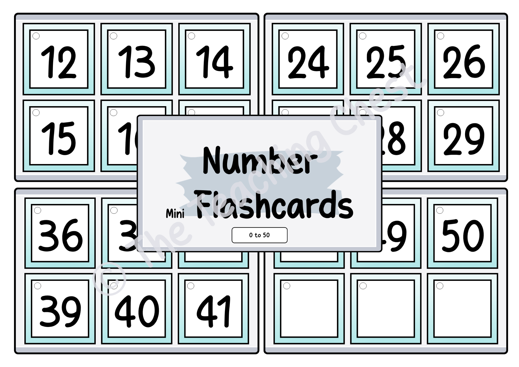 A set of mini number flashcards from 0 to 50 to support the recognition and recall of numbers.