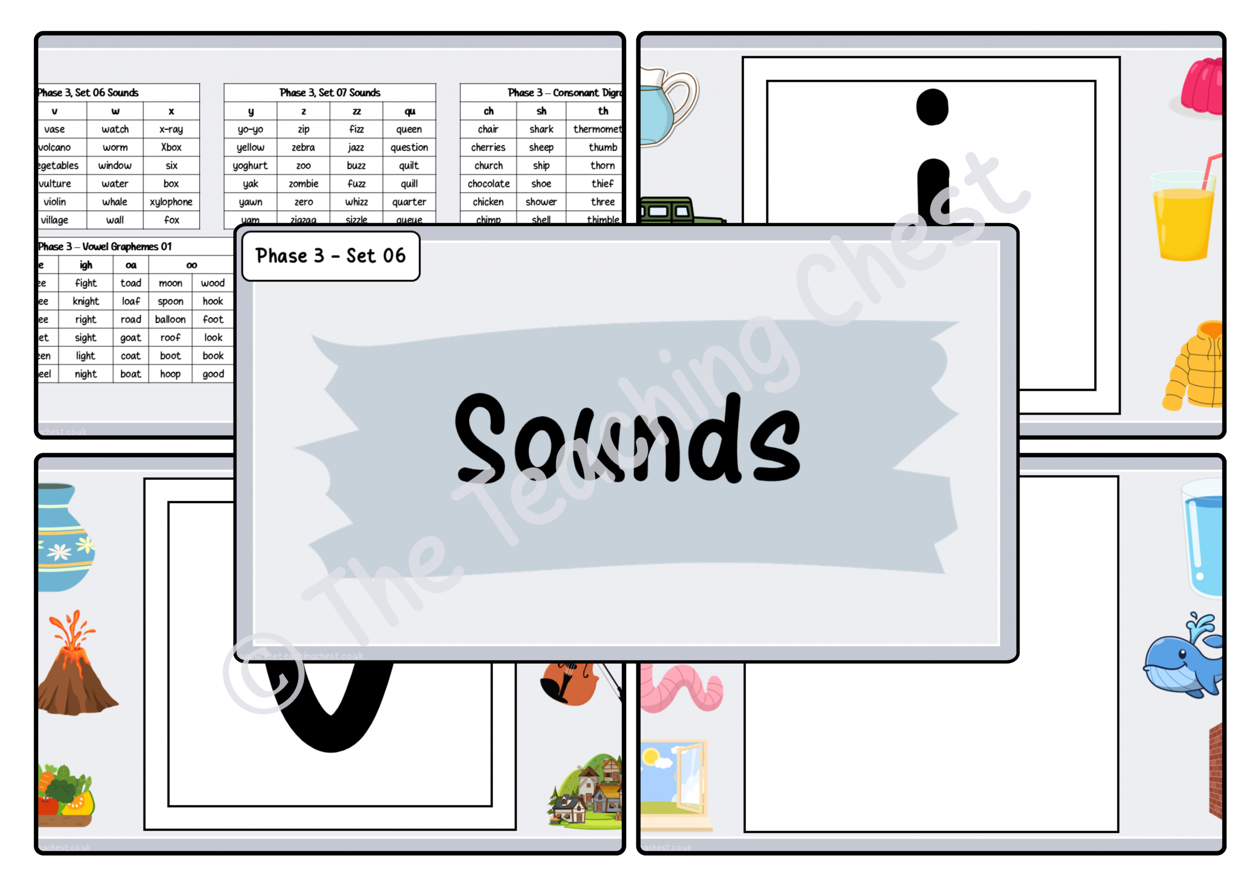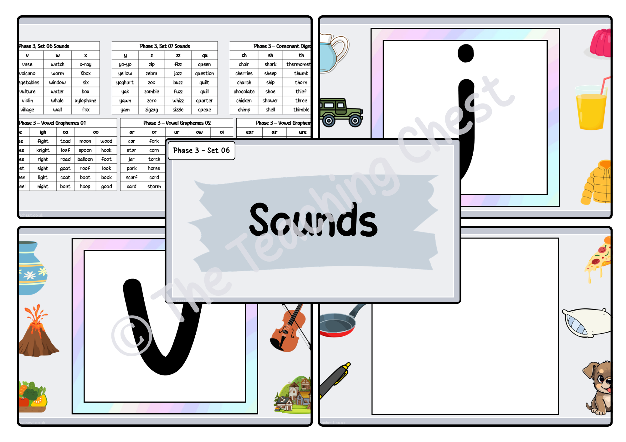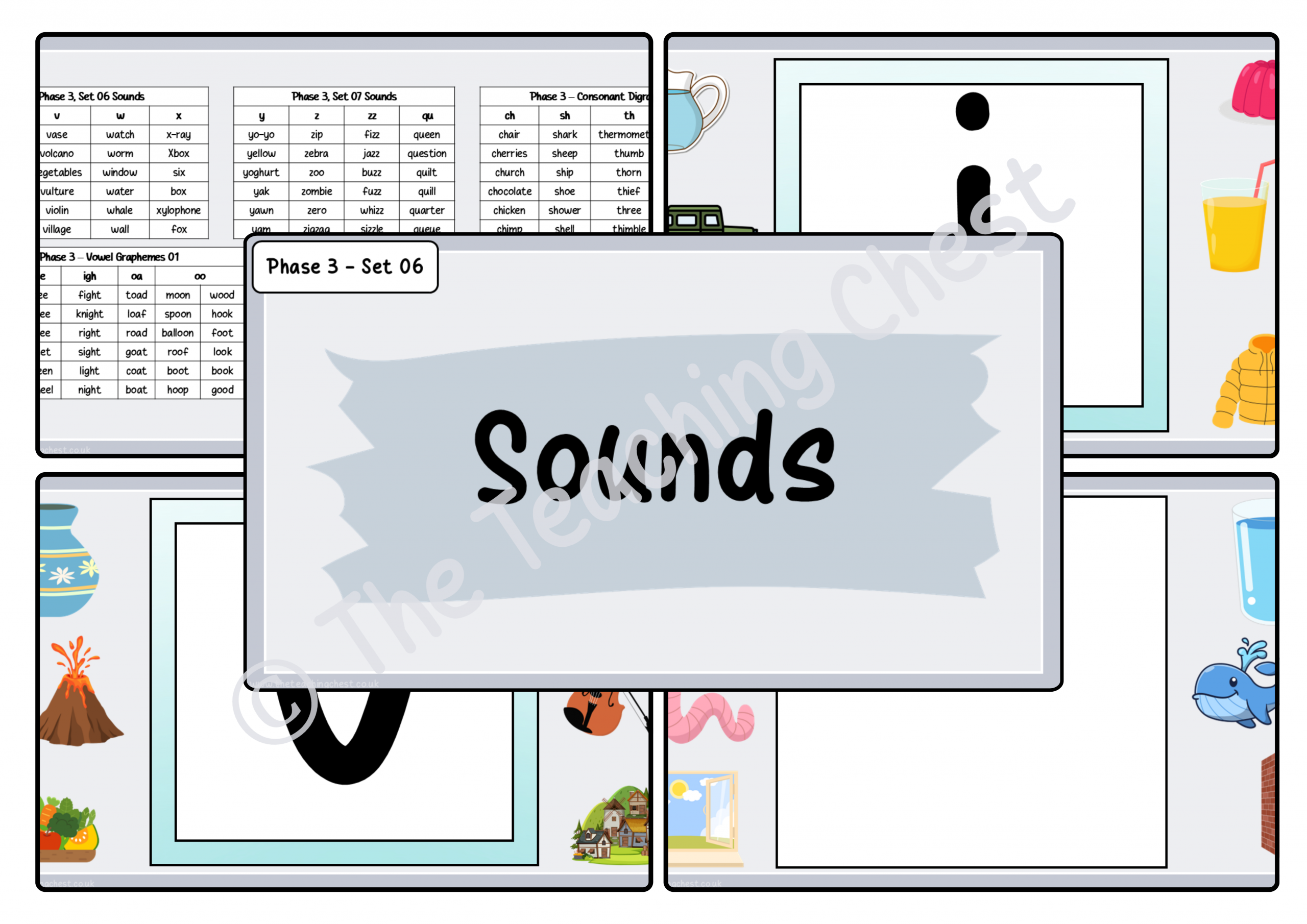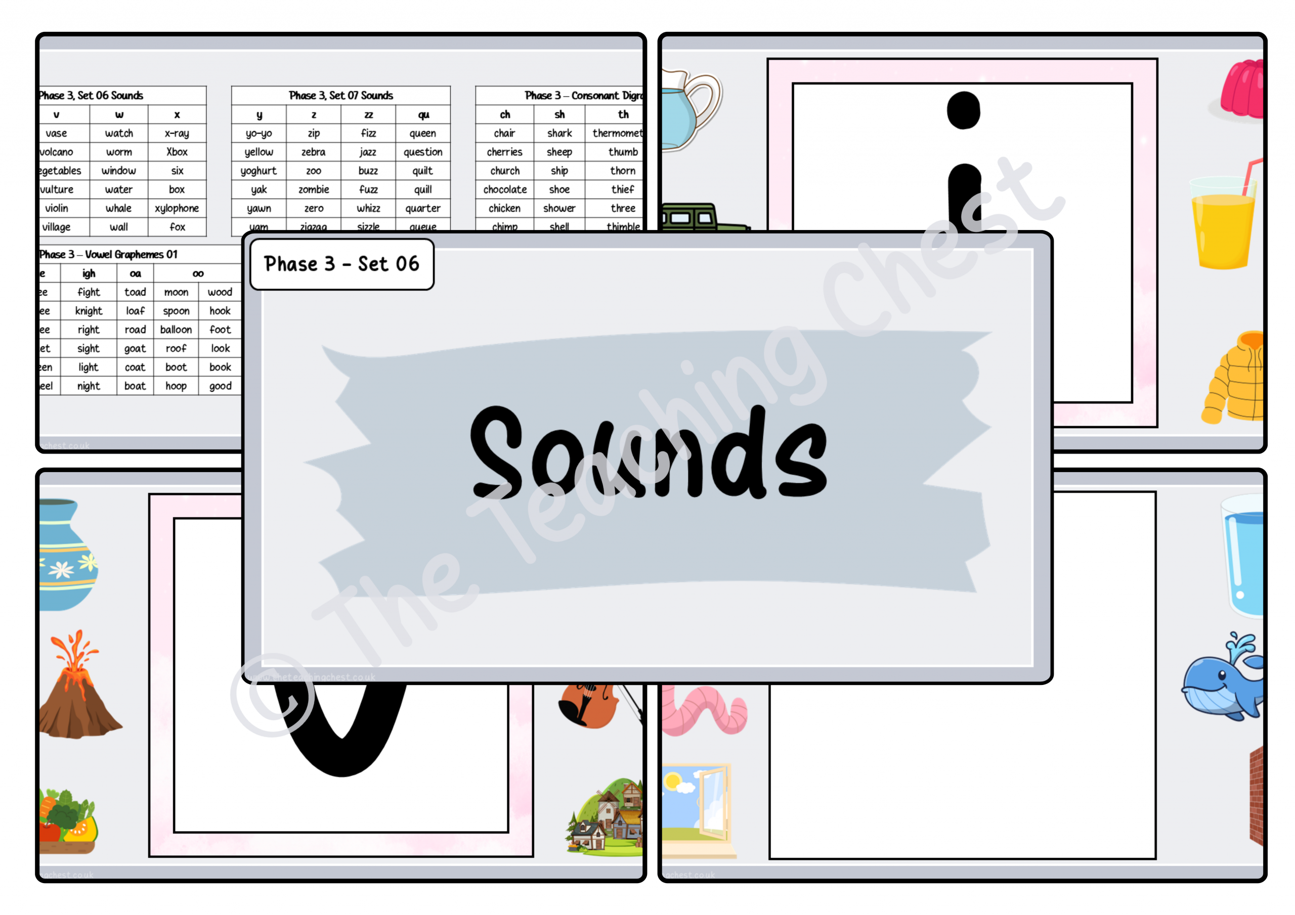 The slides are designed for whole-class teaching, allowing children to associate each sound with a visual cue. Ideal for engaging, interactive lessons, this resource provides a flexible and visually appealing way to reinforce Phase 3 phonics.