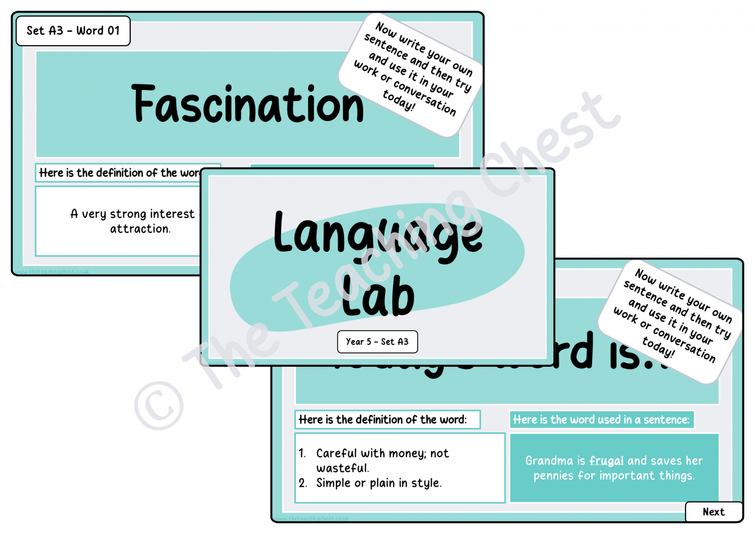 The Language Lab is a whiteboard resource designed to support vocabulary development by introducing pupils to new words in a clear and structured way. Each word is presented with a child-friendly definition and an example used in context, helping pupils to understand both meaning and application.