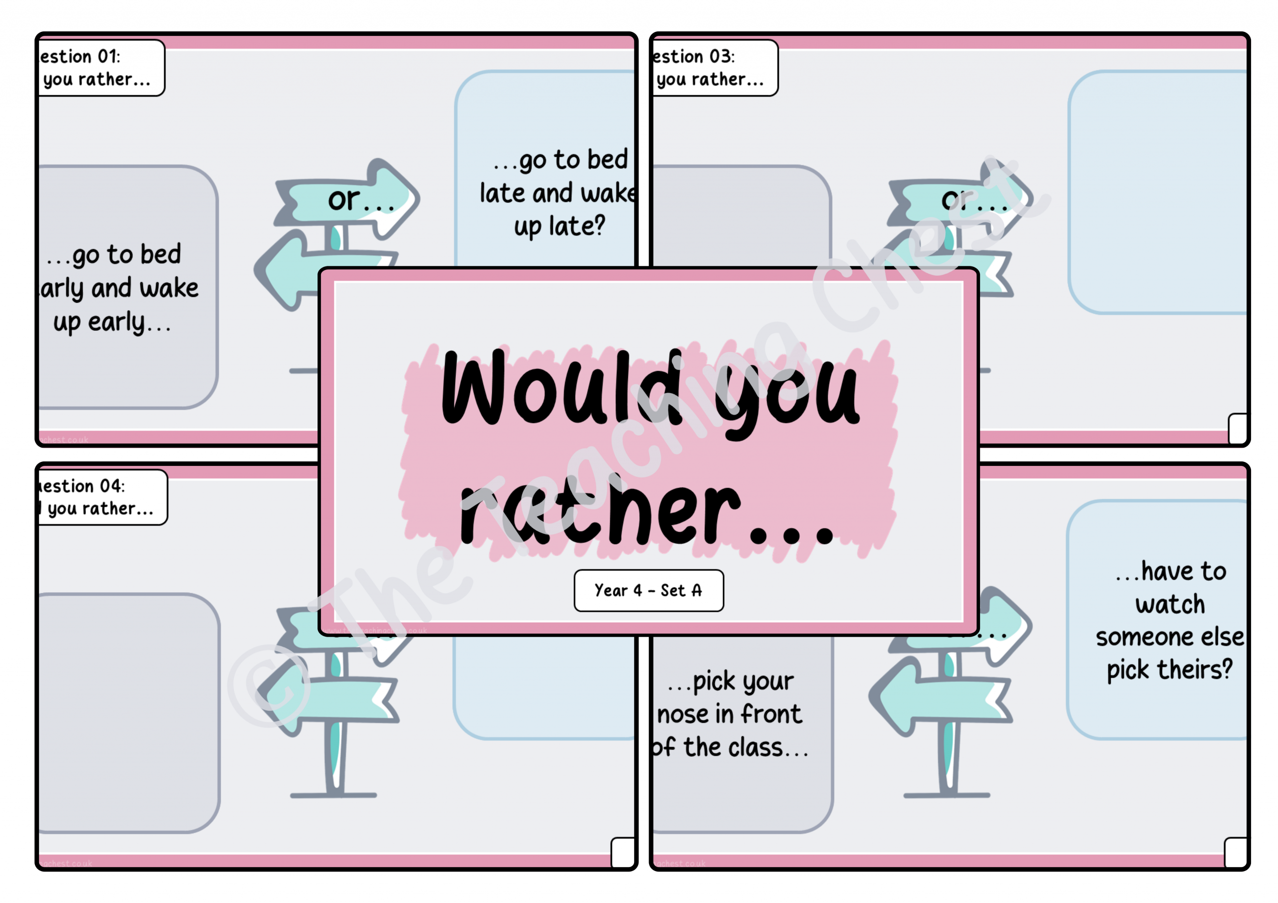 Would You Rather… is a light-hearted activity designed for fun and engagement. Learners are presented with two options and asked to choose between them and should offer some justification in support of their answers. Some options are silly, others a little more sensible but all forms encourage pupils to think, laugh and discuss their choices with peers.